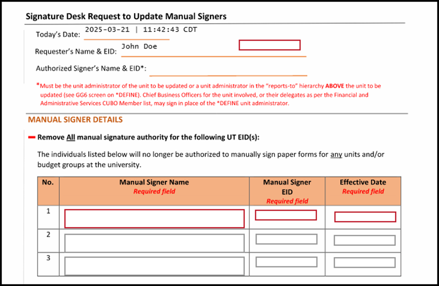 - Add individual Names, EIDs, and Effective dates to the Remove ALL manual signature authority for the following UT EID(s) table. Individuals added to this table will no longer be authorized to manually sign paper forms for any units and/or budget groups at the university.