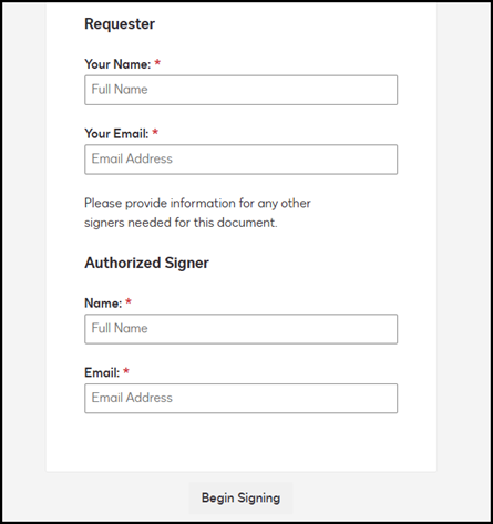Before completing the DocuSign form to Update Manual Signers, you will need to enter both the name of the Requester as well as the name of the Authorized Signer of the unit.