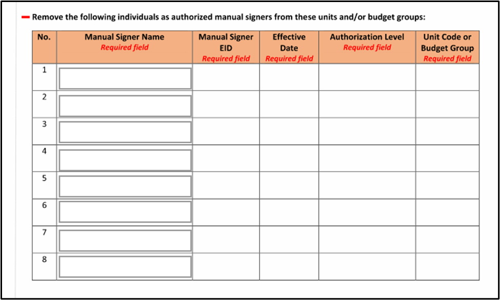- Add Names, UT EIDs, Effective Dates, Authorization Level (enter Unit or Budget Group), Unit Codes or Budget Groups numbers to REMOVE individuals as authorized signers from the units and/or budget groups.