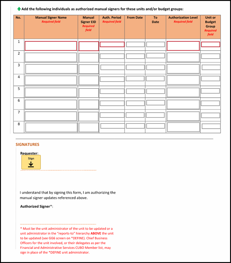 - To ADD individuals as authorized manual signers for units and/or budget groups please list Name, UT EID, Authorization Period, From Date, To Date, Authorization Level, and Unit or Budget Group that you would like the addition to be made to.