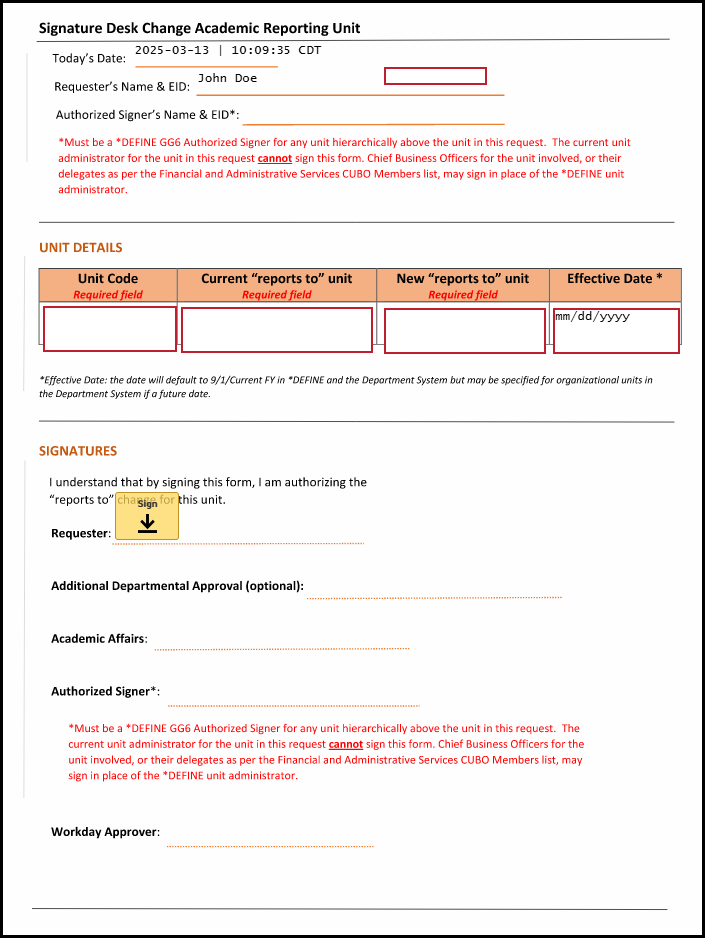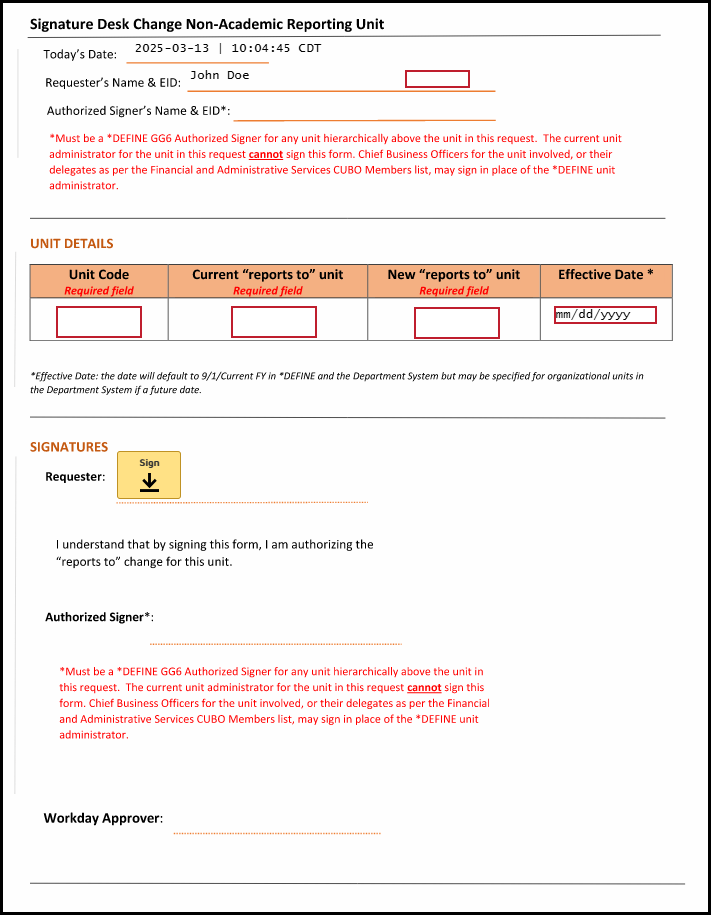 - When completing the Authorized Signer field, please be sure the person entered is an authorized signer of the new unit's report-to unit or a higher unit administrator as shown on the GG6 screen in *DEFINE. The individuals listed on the GG6 screen for the reports-to unit are valid signers, and please be aware the unit head of the new unit is not a valid signer. The Chief Business Officers for the unit involved, or their delegates as per the Financial and Administrative Services CUBO Members list, may sign in place of the DEFINE unit administrator. Any signatures needed from additional teams, such as Academic Affairs, will still be required if listed on the request form.