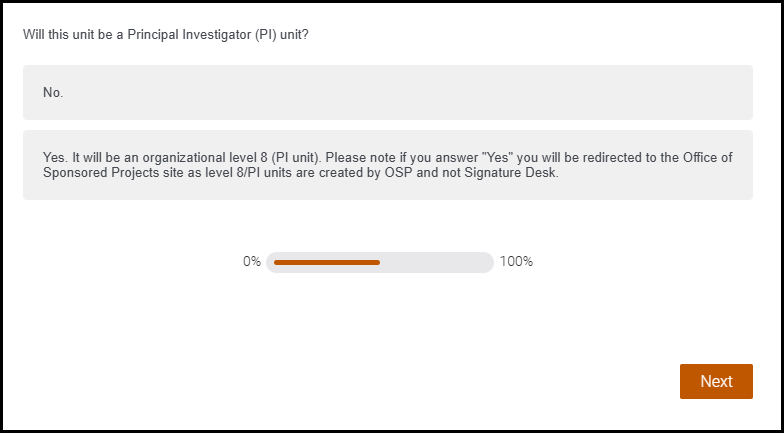 - If Yes is selected and you would like to create a Principal Investigator Unit, then the form will automatically re-direct to the Office of Sponsored Projects as the Signature Desk is not able to create PI Units.