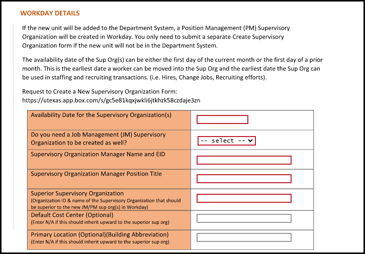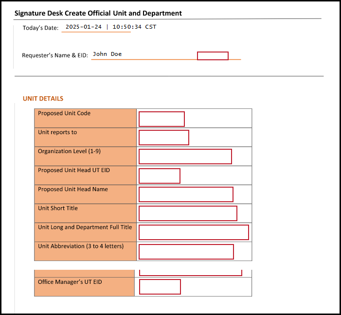 - Enter the Proposed Unit Head UT EID and Name in the Proposed Unit Head UT EID and Name fields. This is the same person counted as the unit head in the Department System if this unit will be organizational. Unit heads have fiscal responsibility and accountability for the accounts under their control. The Signature Desk does not have official guidance on who the Proposed Unit Head should be, but please consult internally about that role.
