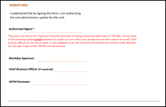 - Enter the name and EID of the Authorized Signer in the Authorized Signer fields. Please be sure the person entered is an authorized signer of the new unit's report-to unit or a higher unit administrator as shown on the GG6 screen in *DEFINE. The individuals listed on the GG6 screen for the reports-to unit are valid signers, and please be aware the unit head of the new unit is not a valid signer. The Chief Business Officers for the unit involved, or their delegates as per the Financial and Administrative Services CUBO Members list, may sign in place of the DEFINE unit administrator. Any signatures needed from additional teams, such as the ASPM representative or Academic Affairs, will still be required if listed on the request form.