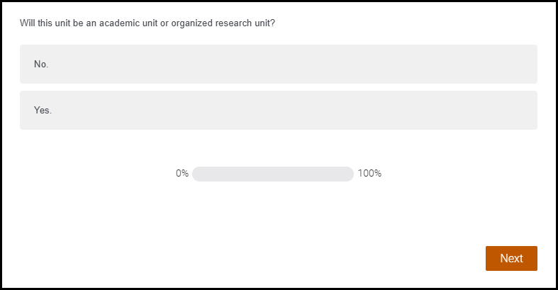 - After selecting Create Official Unit and Department you will be asked if this unit is an academic unit or an organized research unit. Depending on your answers to this and following questions, you will be routed to the correct form to complete. Select either No or Yes and click Next.