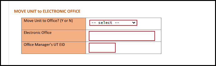 - Enter the Office Manager’s UT EID in the Office Manager’s UT EID field. This is the person in charge of the electronic office you would like to move the unit into. If you are unsure of who this is, please reach out to your department’s financial team.