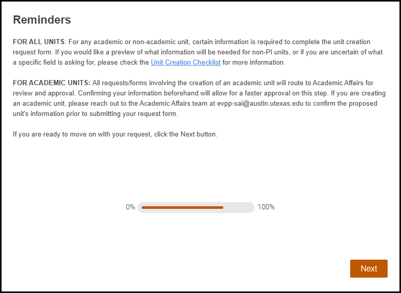 - A reminder will appear on the screen noting that the creation of an academic unit will route to Academic Affairs for review and approval. Please confirm your information beforehand to allow for a faster approval on this step. If you are creating an academic unit, please reach out to the Academic Affairs team at evpp-sai@austin.utexas.edu to confirm the proposed unit's information prior to submitting your request form. Click Next to complete the DocuSign form.