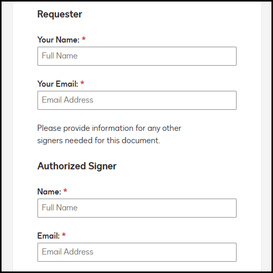 - Click Finish to submit the DocuSign form. You will be automatically directed to a confirmation page and the form will be sent for signing. After it has been signed the Requester will be notified. The document will then be ready for processing by the Signature Desk. If there are any questions regarding the request, they will contact the Requester via the ServiceNow ticket. Upon completion of the request the Signature Desk will notify the Requester.
