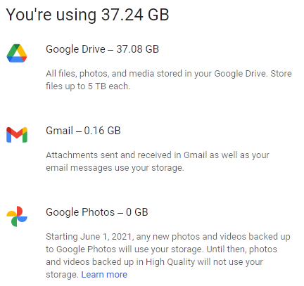 You can review the storage used by your Gmail, Drive, and Photos content at https://drive.google.com/settings/storage:
